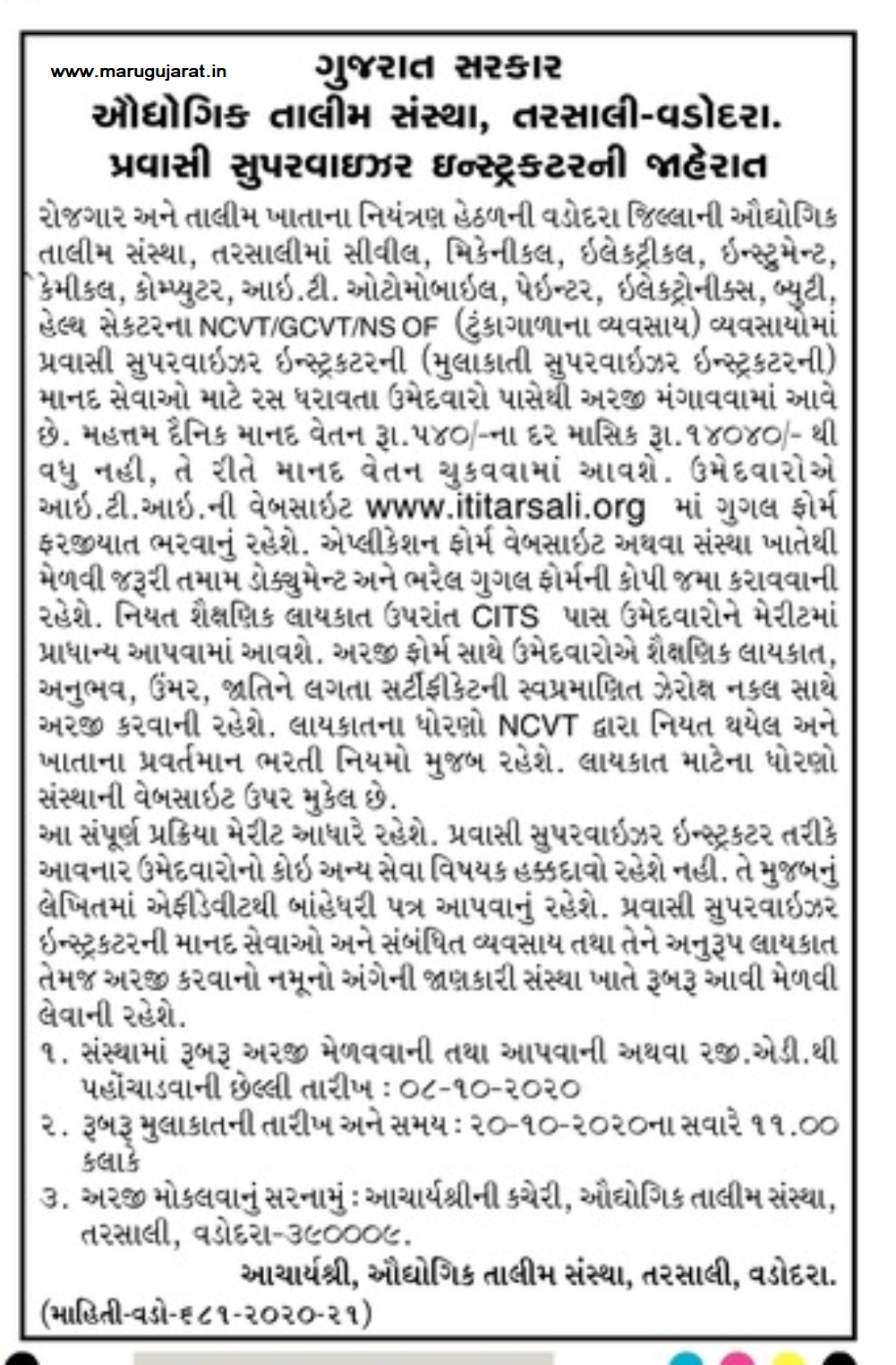 ITI Tarsali-Vadodara Recruitment 2020