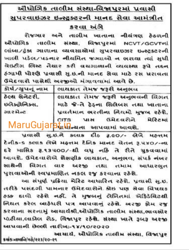 Industrial training institute (ITI), Vijapur has published an Advertisement for the below-mentioned Posts. Eligible Candidates advised to refer to the official advertisement and apply this post. You can find other details like age limit, educational qualification, selection process, application fee, and how to apply are given below. Keep checking GovtBharti.info regularly to get the latest updates.
