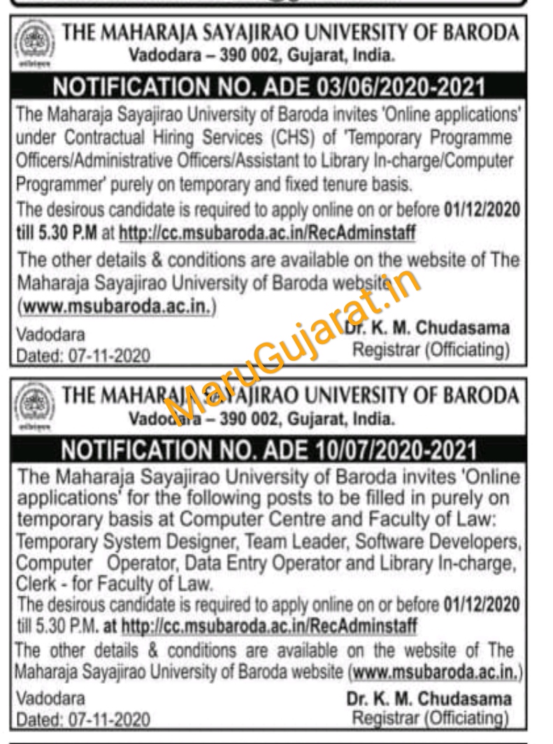 The Maharaja Sayajirao University of Baroda (MSU Baroda) has published an Advertisement for the below-mentioned Posts. Eligible Candidates advised to refer to the official advertisement and apply this post. You can find other details like age limit, educational qualification, selection process, application fee, and how to apply are given below. Keep checking Govtbharti.info regularly to get the latest updates.