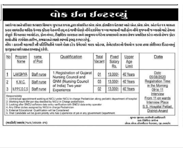 SS Hospital Petlad, Anand has published an Advertisement for below-mentioned Posts. Eligible Candidates are advised to refer to the official advertisement and apply this post. You can find other details like age limit, educational qualification, selection process, application fee and how to apply are given below. Keep checking regularly to get the latest updates.